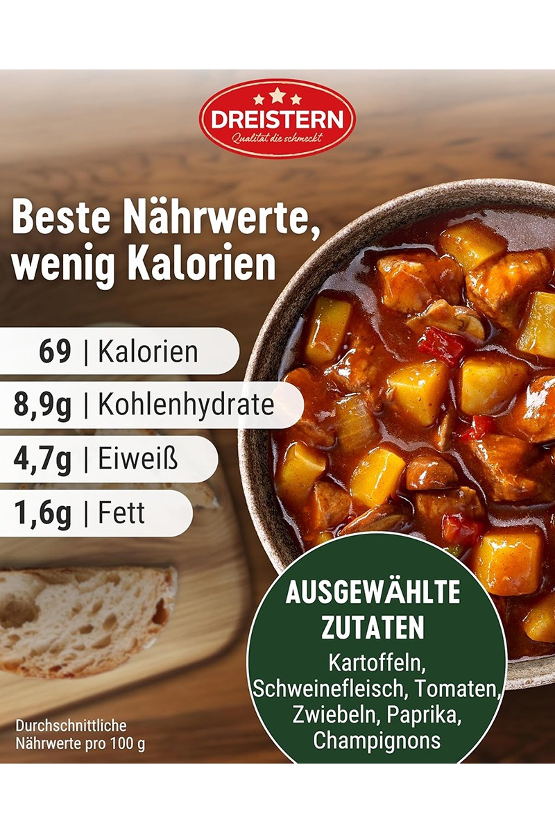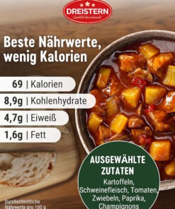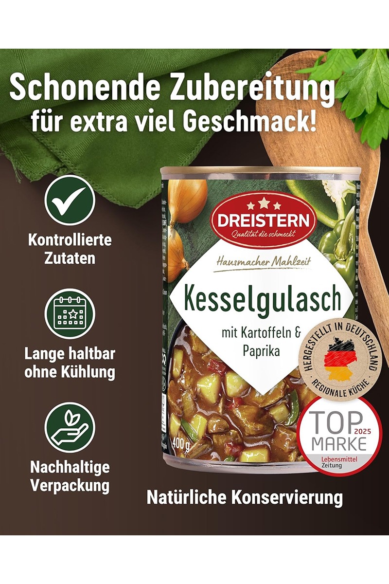 Dreistern Kesselgulasch (Gulas la ceaun), este o mancare traditionala germana gata preparata, ambalata in conserva de 400g.