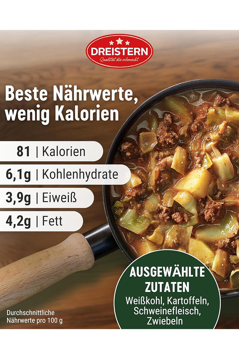 Ingrediente: 32% varză albă, 19% cartofi, apă potabilă, 12% carne tocată de porc, slănină de porc, ceapă, amidon modificat, sare de masă iodată (sare de masă, iodat de potasiu), uleiuri vegetale (rapiță, porumb, floarea soarelui), pastă de roșii, făină (grau, orez), sirop de zahăr caramel (sirop de glucoză, zahăr), amidon de cartofi, produs proteinic (conține lactoza), extracte de condimente, maltodextrină, extract de carne de vită, zahăr, pulbere de roșii, pulbere de țelină, extracte vegetale ( contine CELERY), condimente, sare din lemn de fag afumat. Poate conține urme de muștar.