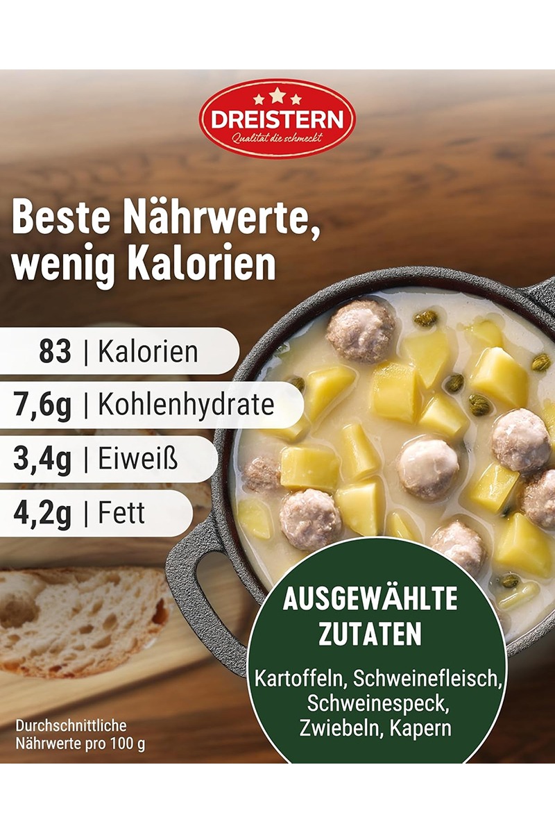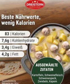 Ingrediënt: apă potabilă, 28% cartofi, 20% găluște (71% carne de porc (parțial tocată mărunt), slănină de porc, apă potabilă, pesmet (faina de grau, sare de masa, drojdie), sare de masă iodată (sare de masa, iodat de potasiu), ceapa, amidon modificat, amidon de porumb, sirop de glucoză, condimente), amidon modificat, uleiuri vegetale (floarea soarelui, porumb), 1,3% capere, faina de grau , oțet de coniac, zahar, maltodextrina, sare de masa iodata (sare de masa, iodat de potasiu), proteine din lapte (conține lactoza), sirop de glucoza, extract de carne de vita: acid citric, amidon, agenti de îngrosare: gumă de guar, condimente, extracte de condimente (conține telina) Poate conține urme de muștar și ou.