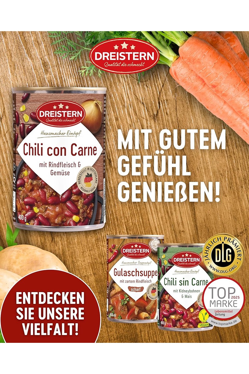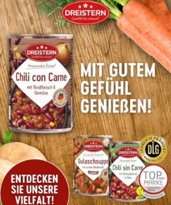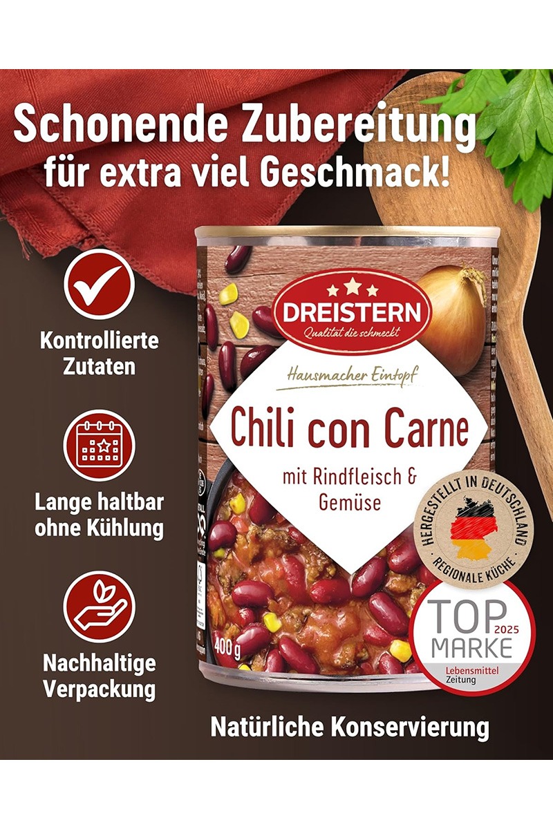 Dreistern Chili con Carne, este o mancare gata preparata, realizata in Germania. Aceasta conserva contine o tocana picanta de fasole kidney, rosii si legume, combinata cu carne de vita tocata (100% vita conform etichetei).
