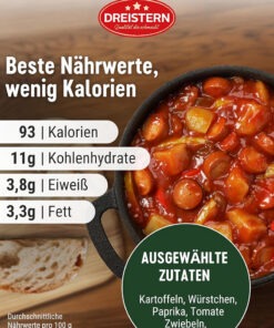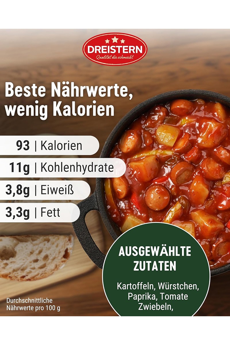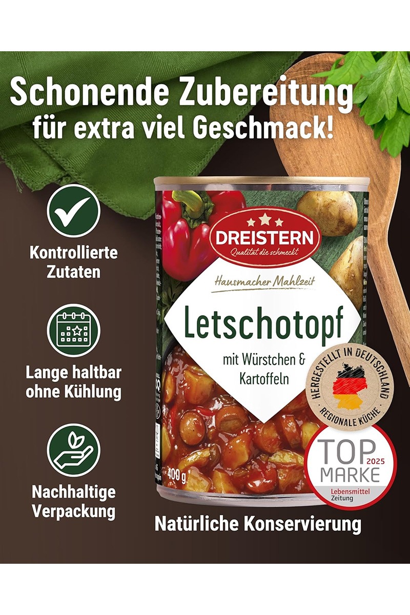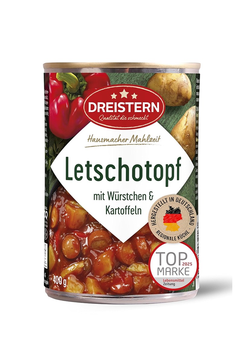 Dreistern Letschotopf, o mancare gata preparata (ghiveci de legume tip lecsó) cu carnaciori si cartofi, ambalata intr-o conserva de 400g. Este o reteta rustica din gama „Hausmacher Mahlzeit”, produsa in Germania.