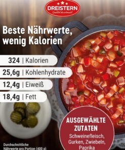 Dreistern Soljanka este o ciorba traditionala de inspiratie est-europeana, foarte populara in Germania, ambalata in conserva de 400 g.