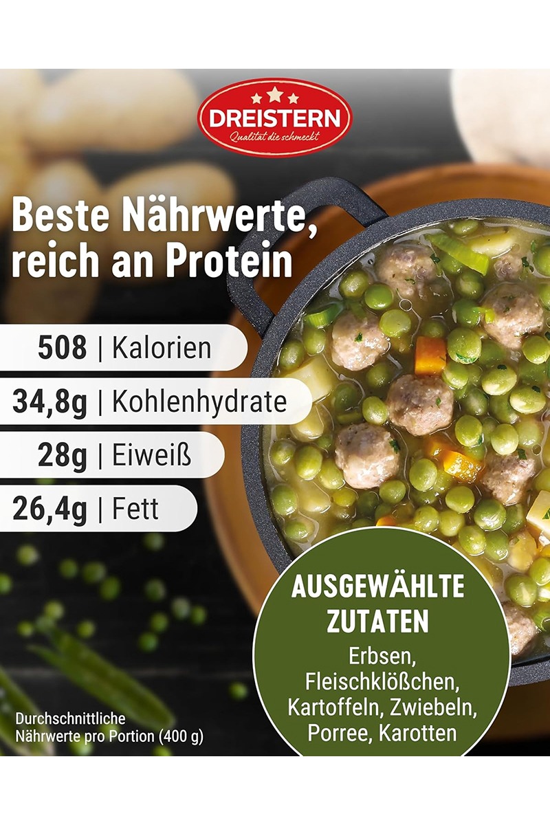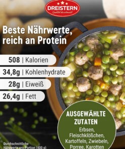 Ingrediente: apă potabilă, 25% mazăre, 17% cârnați wiener în felii (carne de porc, apă potabilă, sare de masă, extracte de condimente, condimente, bulion granular (proteine vegetale hidrolizate, sare de masă), zahăr din struguri, maltodextrină, conservanți: nitrit de sodiu, , fum de lemn de fag), cartofi, șuncă tăiată cubulețe (carne de porc, sare de masă, zahăr, dextroză, aromă naturală de condimente, conservant: nitrit de sodiu, fum de lemn de fag), amidon modificat, 1% morcovi, ceapă, praz, faina de grau, legume uleiuri (rapiță, porumb), zahăr, sare de masă, maltodextrină, extract de carne de vită, îngroșător: gumă de guar, acidifiant: acid citric, amidon, condimente (conține telina), dextroză, extracte de condimente (conține telina), maghiran.